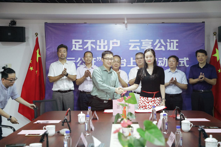 福建省侨办侨政处处长陈传应、省侨联权益保障部部长王罡、省司法厅公法处处长林鸿川、福州市侨办海外处处长陈发俤、厦门市鹭江公证处主任苏国强等人一起见证了“云公证”平台上线。